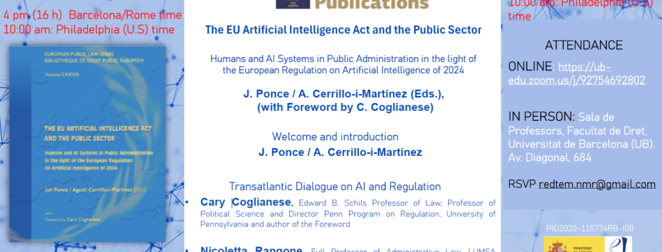 On December 10 2025, the presentation of the book titled "The EU Artificial Intelligence Act and the Public Sector – Humans and AI Systems in Public Administration in light of the European Regulation on Artificial Intelligence of 2024" will take place. The event, starts at 4:00 PM (Barcelona-Rome time/10:00 AM Philadelphia time), can be followed in person (Faculty of Law of the University of Barcelona – RSVP: redtem.nmr@gmail.com ) or online ( https://ub-edu.zoom.us/j/92754692802 ).